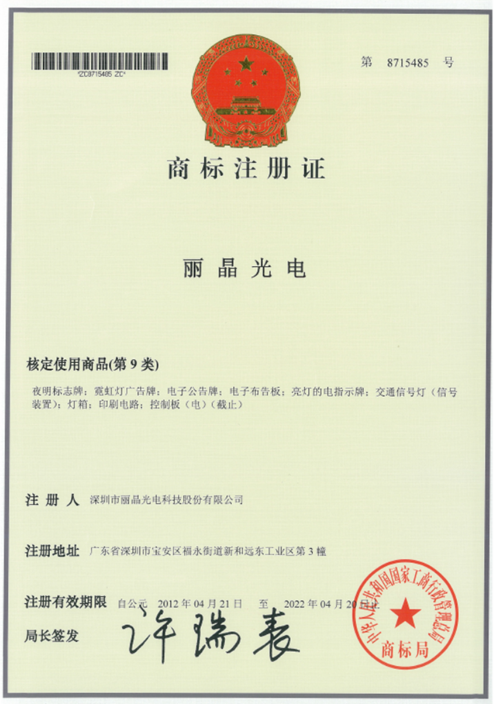 能讓大家引起重視實(shí)屬好事,但不慎用詞之問題卻傷害了無辜的廠家!我司是深圳市麗晶光電科技股份有限公司,成立于2004年11月21日,從事經(jīng)營LED顯示屏產(chǎn)品的研發(fā)、生產(chǎn)和銷售,至今沒有上市,且我司擁有麗晶光電商標(biāo)注冊(cè)權(quán)(下圖可見),品牌名字雖是相同,經(jīng)營業(yè)務(wù)、公司高管完全與杭州麗晶光電沒有任何關(guān)聯(lián)!